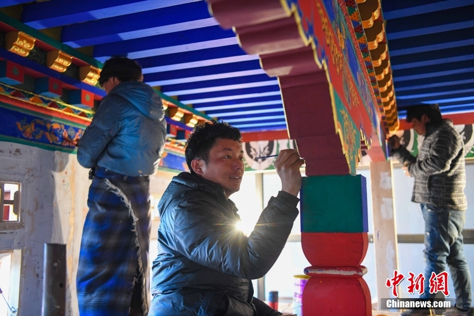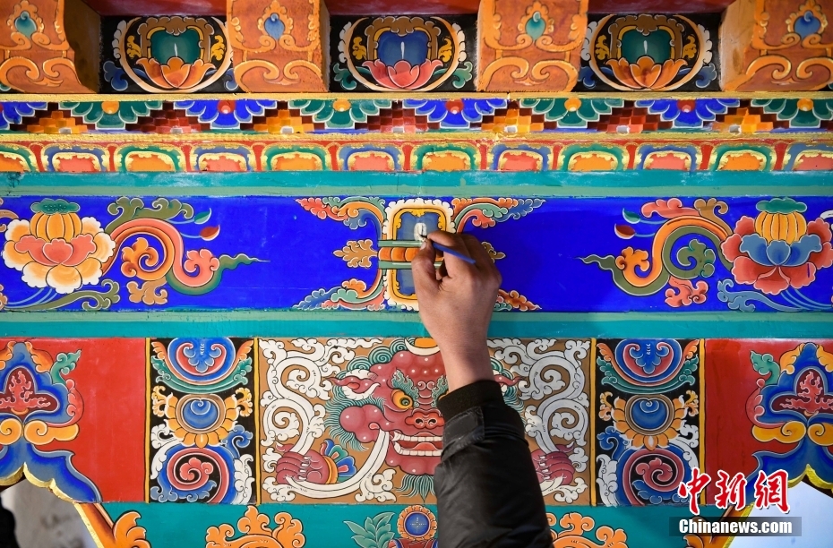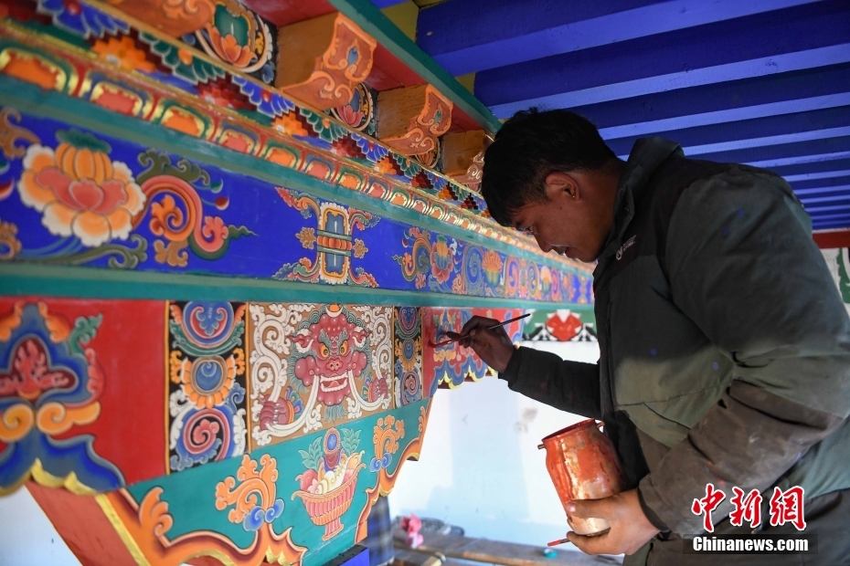 12月28日,西藏拉薩堆龍德慶區(qū),古俗民族傳統(tǒng)手工藝發(fā)展專業(yè)合作社員工在房屋上繪制藏式裝飾。據(jù)悉,該合作社以繪畫、木工、縫紉為主,承接傳統(tǒng)手工藝方式制作家具、房子裝修、唐卡繪畫、旅游產(chǎn)品、文物建筑維修等工作。自2018年合作社成立至今,帶動(dòng)就業(yè)共60余人。 中新社記者 貢嘎來松 攝