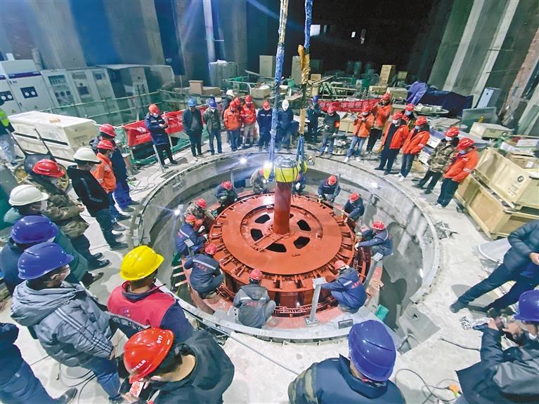 圖為西藏湘河水利樞紐首臺機組轉子吊裝現場。通訊員 李駿 王剛 攝