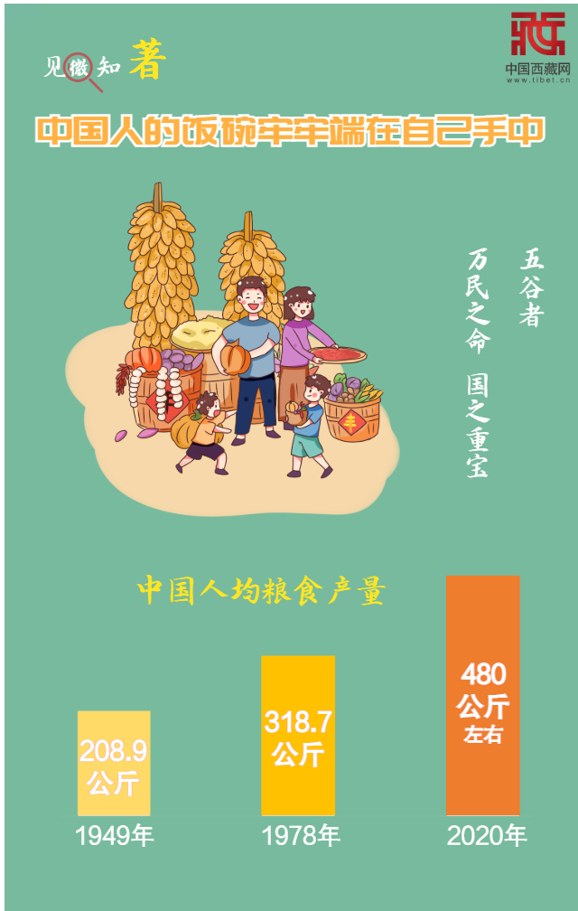 民以食為天。2020年,我國糧食又高位增產(chǎn),供需總量基本平衡。中國人均糧食產(chǎn)量,從1949年的208.9公斤,到1978年的318.7公斤,再到2020年的480公斤左右,高于400公斤的國際糧食安全標準線。中國人的飯碗牢牢端在自己手中。(中國西藏網(wǎng) 制圖/楊月云)