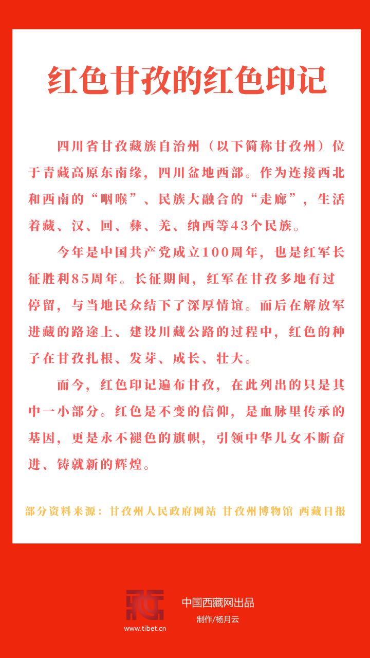 而今,紅色印記遍布甘孜,在此列出的只是其中一小部分。紅色是不變的信仰,是血脈里傳承的基因,更是永不褪色的旗幟,引領(lǐng)中華兒女不斷奮進(jìn)、鑄就新的輝煌。
