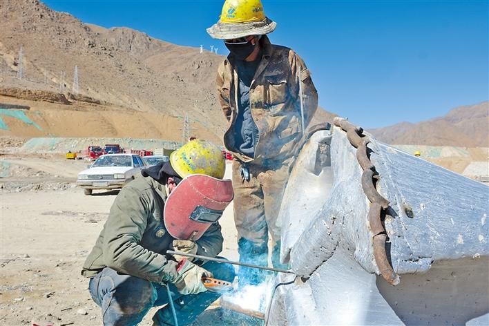 施工人員在修理機器。記者 陳林 扎西頓珠 攝