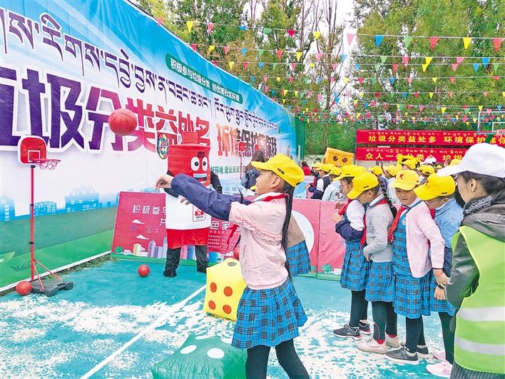 在拉薩市城關(guān)區(qū)組織開展的“不忘初心、牢記使命”主題教育暨“垃圾分類黨員先行 守護凈土人人有責”活動現(xiàn)場,學生代表參加趣味游戲。