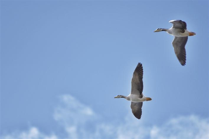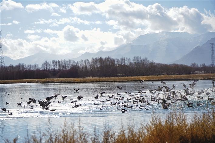 遠(yuǎn)處,連綿起伏的山頂還覆蓋著薄薄的積雪,布達(dá)拉宮雄偉而秀美;近處,濕地內(nèi)隨意顯現(xiàn)出的一塊塊水泊,成群的候鳥在水中玩耍嬉戲、在藍(lán)天白云下飛舞。見到可愛的飼養(yǎng)員帶來它們喜歡的麥粒,斑頭雁、紅隼、赤麻鴨、黃鴨等紛紛游上岸來,盡情地享受美食,發(fā)出歡快的叫聲。