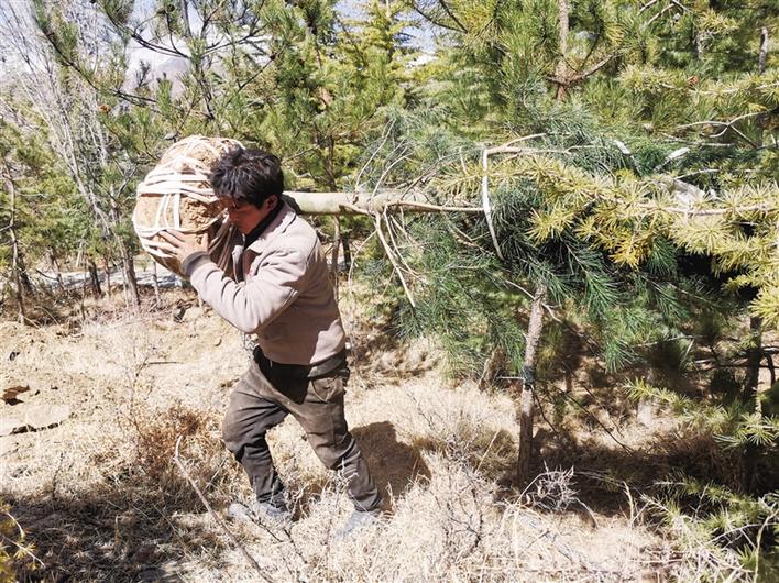 搬運(yùn)準(zhǔn)備種植的苗木。文/圖 記者 李海霞
