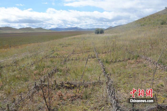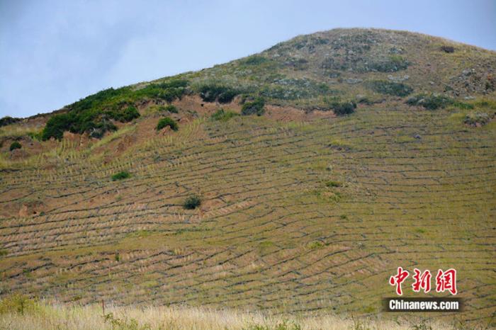 走進(jìn)四川省阿壩州若爾蓋縣轄曼鎮(zhèn)西倉村治沙點(diǎn),山坡上巨大的“棋盤”格外醒目??h林草局生態(tài)修復(fù)股助理工程師涂勝介紹,這是用于治理草原沙化的高山柳沙障。