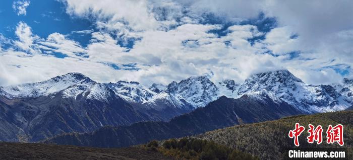 圖為銀白色白馬雪山與綠色植被勾勒生態(tài)畫卷。 張?zhí)砀!z