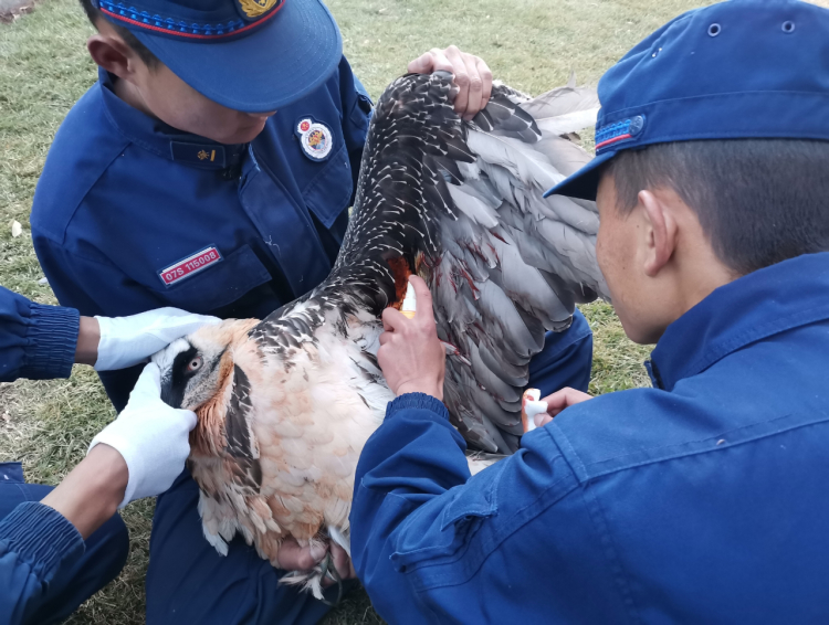 情況緊急,中隊指戰(zhàn)員立即將受傷胡兀鷲帶回中隊,安排衛(wèi)生員對其翅膀受傷部位進行了診斷、清創(chuàng)、消毒、上藥等一系列外傷緊急治療。并對其進行了強制性飲水、喂食,經中隊指戰(zhàn)員的精心照料和治療,胡兀鷲脫離了危險,于11月20日上午與卡若區(qū)林草局野生動物救助站交接,讓工作人員將它帶回進一步觀察治療,待它健康后放歸大自然。