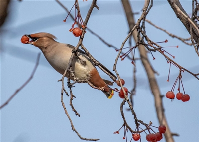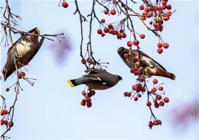 記者從省動(dòng)物學(xué)會(huì)鳥(niǎo)類學(xué)分會(huì)成員胡老師處了解到,11月24日下午他也在海棠公園觀賞太平鳥(niǎo),從比例估算這次大約有一千多只太平鳥(niǎo)飛來(lái)海棠公園,是近年來(lái)出現(xiàn)鳥(niǎo)兒最多的一年。去年海棠公園出現(xiàn)了約三百多只太平鳥(niǎo),2017年、2018年它們出現(xiàn)的比較分散,在南山公園、寧湖濕地公園、海棠公園都有出現(xiàn),每處數(shù)量也只有五六十只,2018年在大通濱河公園也出現(xiàn)過(guò),數(shù)量有二三十只左右。太平鳥(niǎo)在青海早就有記錄,太平鳥(niǎo)為鳥(niǎo)綱太平鳥(niǎo)科、體長(zhǎng)約18厘米、壽命約13年左右。它們喜歡吃漿果,所以海棠果也就成為了它們的美味佳肴,春天也吃垂柳嫩葉,一般棲息于針葉、闊葉混交林中。
