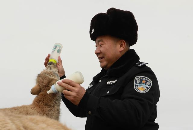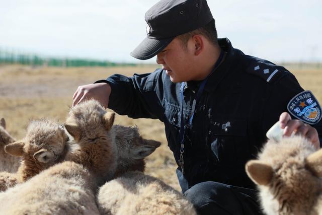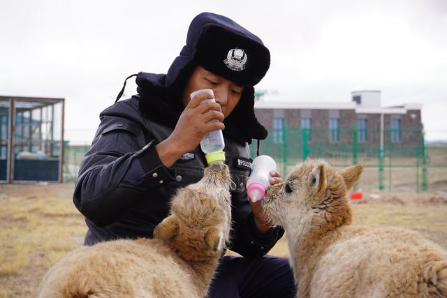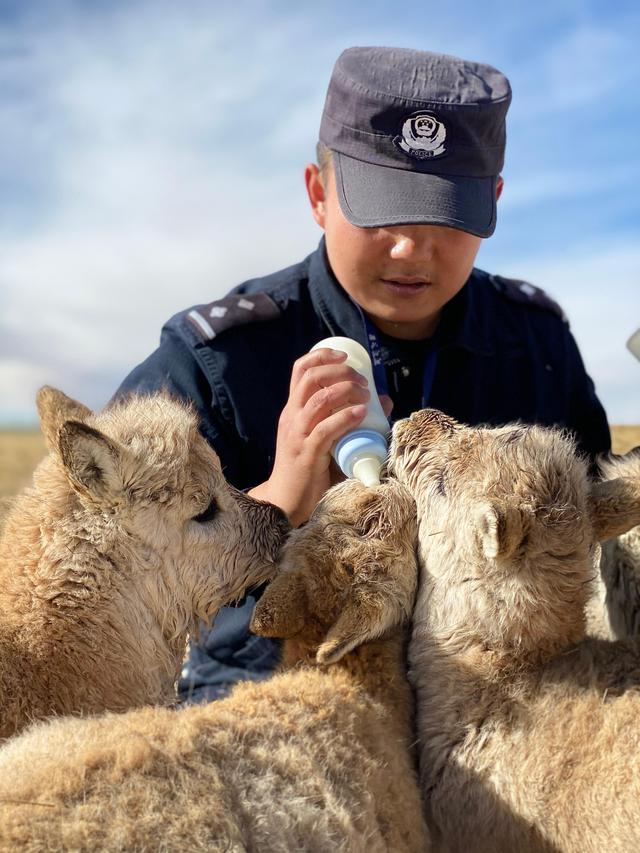 12月7日,在給藏羚羊幼仔喂奶前,可可西里索南達(dá)杰保護(hù)站站長(zhǎng)趙新錄(中)用嘴測(cè)試奶溫。