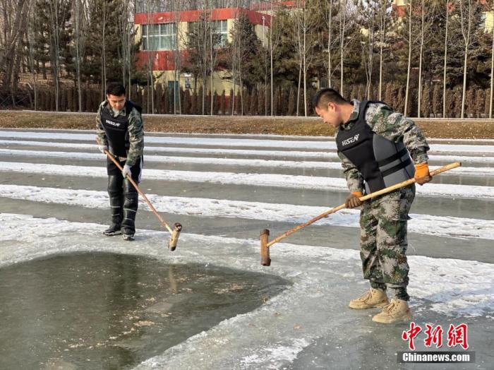 資料圖為2020年12月28日,青海湖裸鯉救護(hù)中心工作人員在室外漁場(chǎng)破冰觀察裸鯉活動(dòng)情況。 中新社記者 李江寧 攝