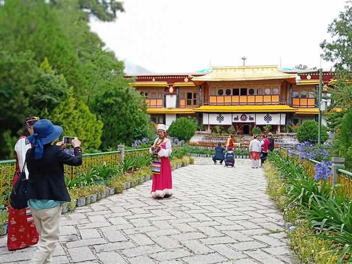 羅布林卡內(nèi)一步一景,每一處都能發(fā)現(xiàn)各類品種的花卉,在達(dá)旦明久頗章前面的水池內(nèi),幾朵睡蓮在雨水的滋養(yǎng)下盡情舒展開來。宮殿內(nèi)、石板路邊擺放的一盆盆盛開的鮮花,像是臉上堆滿了笑容的少女。人們對(duì)于優(yōu)美的風(fēng)景總是毫無抵抗力,紛紛拿起手中的相機(jī)、手機(jī)拍照留念,讓美好瞬間定格于此。連一旁休憩的老奶奶都情不自禁地想幫路人拍照。