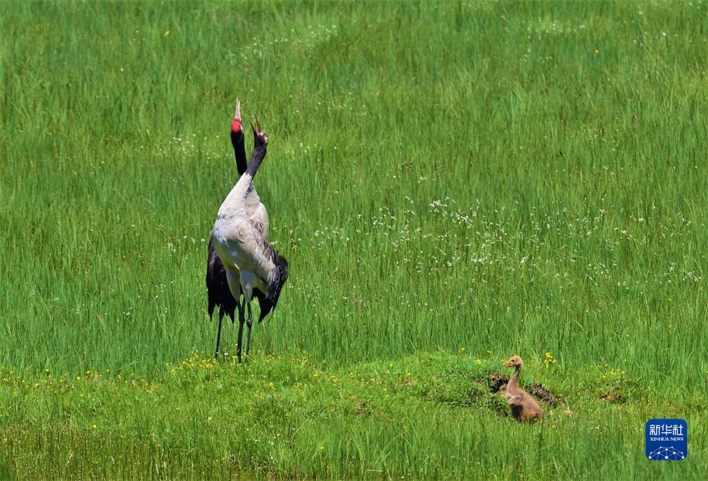這是在四川省阿壩藏族羌族自治州紅原縣境內(nèi)拍攝的帶著幼崽的黑頸鶴(2021年2月22日攝)。新華社 王冀川 攝