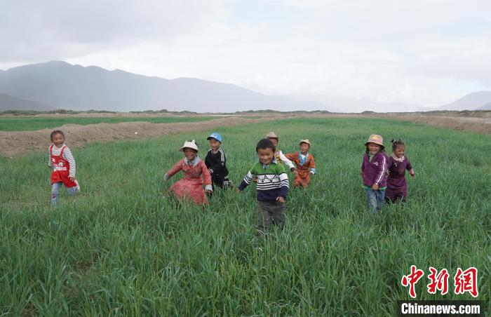 在綠麥草草場(chǎng)上玩耍的藏族兒童?!∨诵衽R 攝