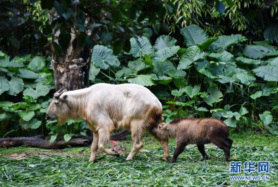 圖為金毛羚牛寶寶追著媽媽吃奶 新華社記者劉大偉 攝