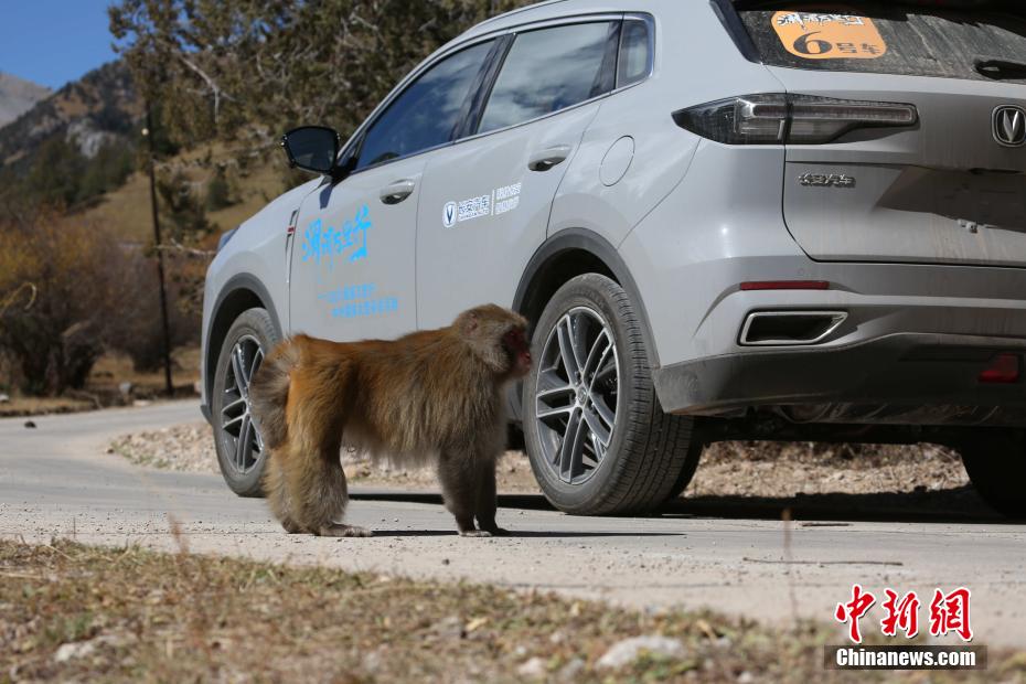 圖為一只藏獼猴近距離接觸2021瀾湄萬里行活動用車。張希紅 攝