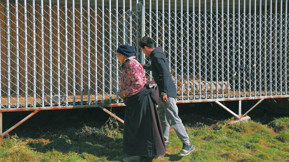 “在巖壁下發(fā)現(xiàn)了它,因為流血過多已經(jīng)奄奄一息了。它的一個前肢斷了,現(xiàn)在走路還是一瘸一拐的?!蓖瑸樽o林員的根呷介紹,當時這只雪豹在同另外一只雪豹搶食落敗后受傷,因為真達鄉(xiāng)尚未建立動物救助中心,雪豹便寄養(yǎng)在甲它家中。鄉(xiāng)政府出資修建了雪豹居住的“鐵籠”,甲它負責給它喂食,甲它的妻子則每隔一段時間就要為這頭猛獸打掃一次圈舍。