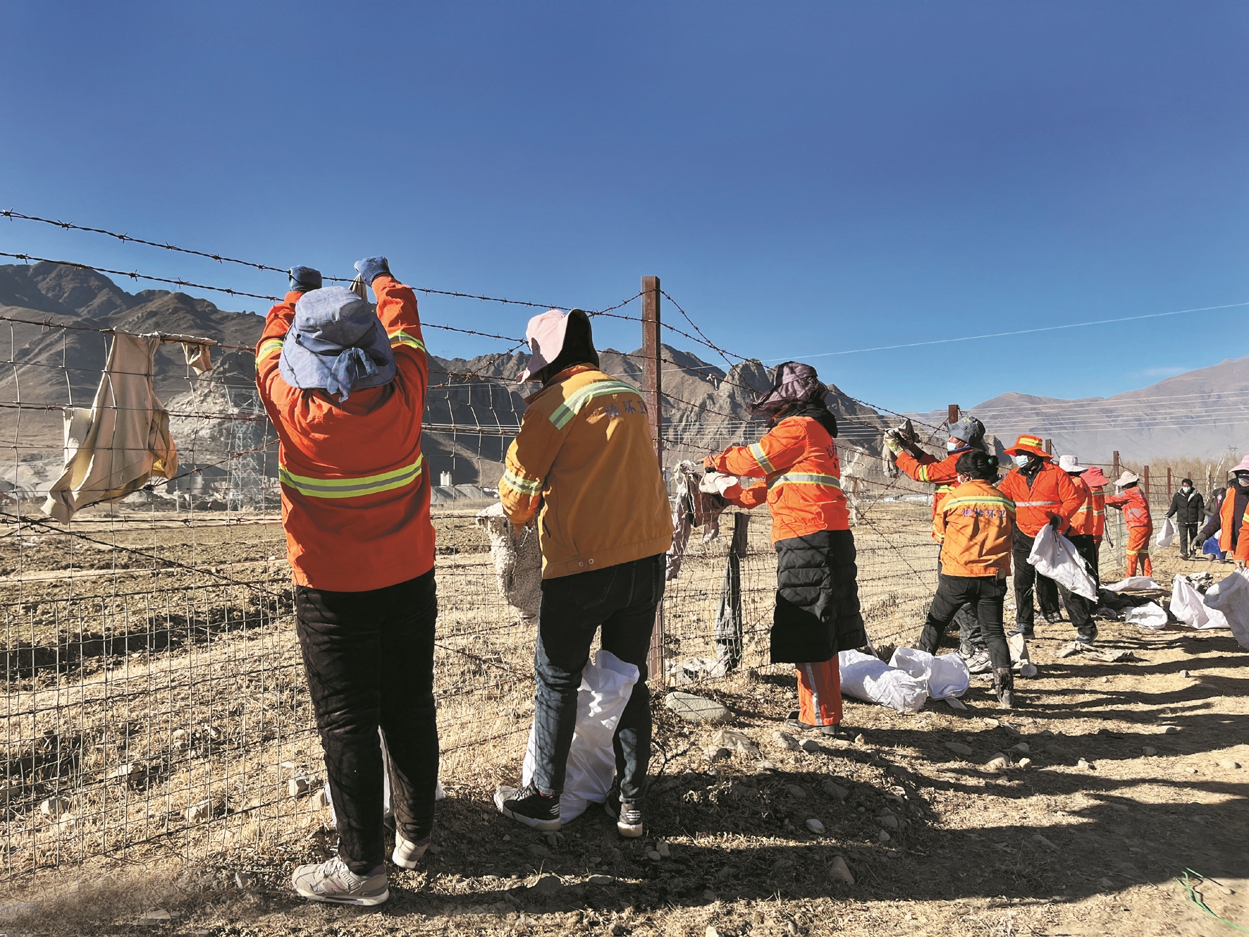 圖為柳梧街道鄉(xiāng)村保潔隊(duì)正在清理農(nóng)田網(wǎng)欄上的舊衣服。拉薩融媒記者 旦 達(dá)攝