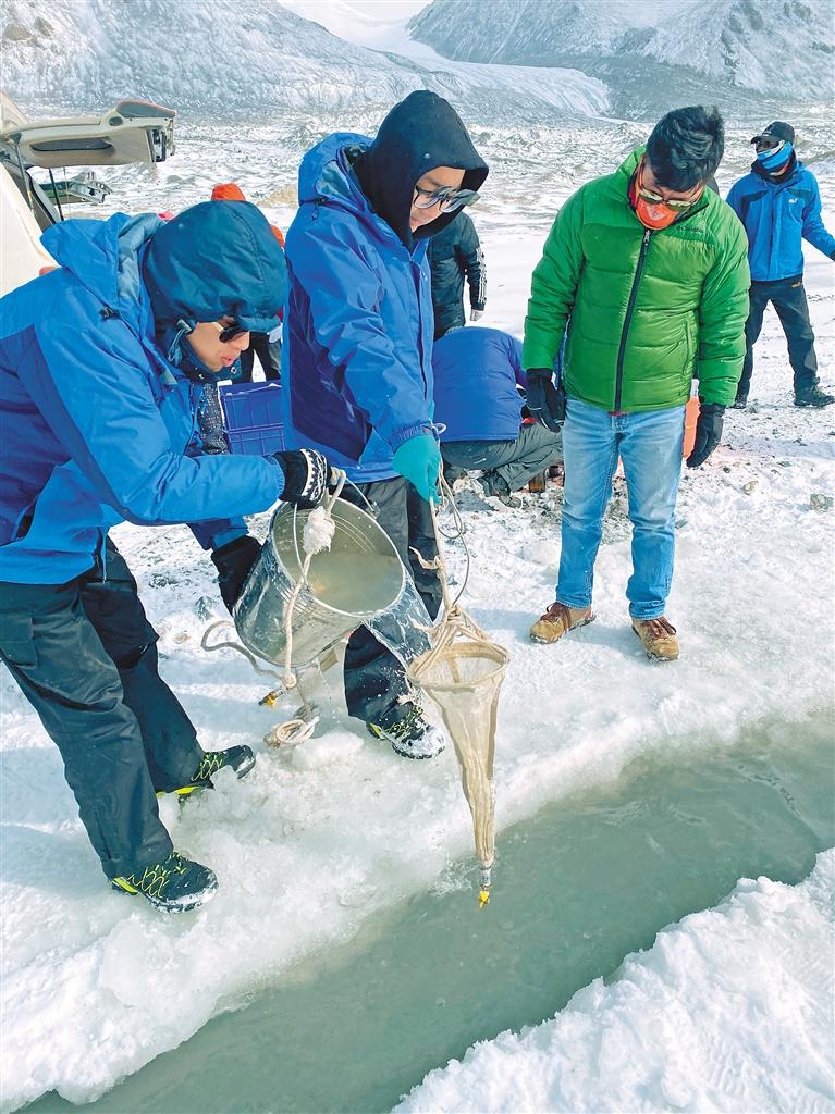 為全面系統(tǒng)摸清水質(zhì)狀況,監(jiān)測組在崗加曲巴冰川末端融水河流斷面開展了水溫、電導(dǎo)率、溶解氧、PH值的現(xiàn)場監(jiān)測,同時開展了微塑料、抗生素等指標(biāo)的全分析及生態(tài)監(jiān)測的采樣工作。