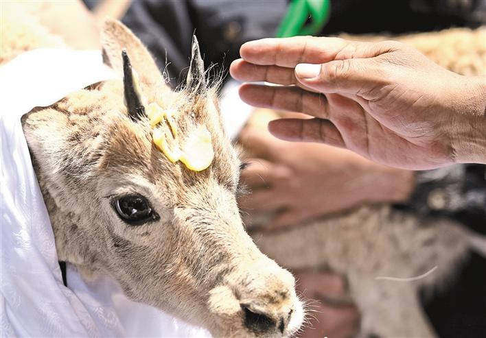 7月7日,在可可西里索南達杰保護站野生動物救助中心,三公兩母共五只人工救助的藏羚羊被放歸大自然。圖為7月7日,在可可西里索南達杰保護站野生動物救助中心,可可西里巡山隊員按照風俗,在藏羚羊額頭上涂抹酥油表達祝福。[詳細]