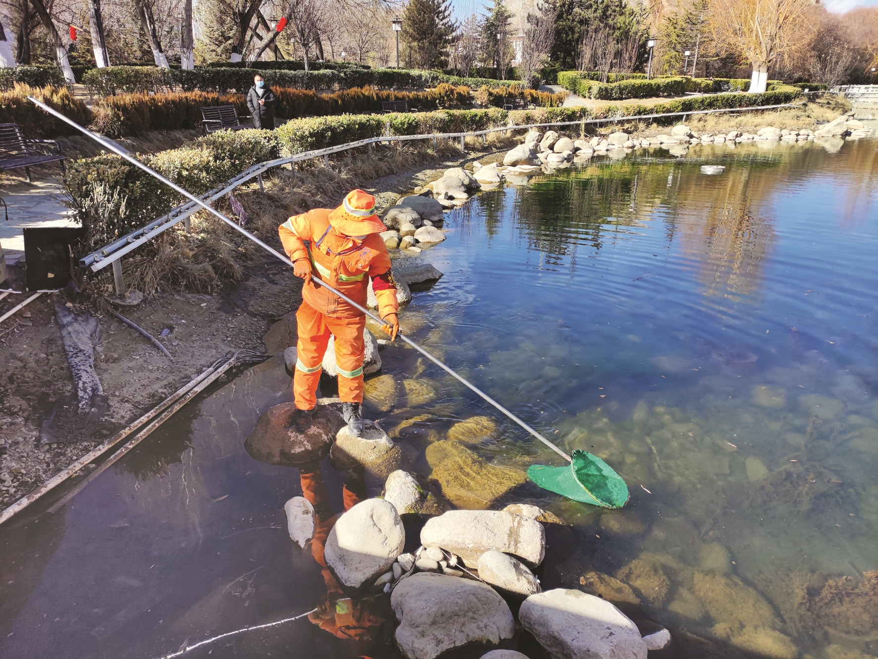圖為布達拉宮廣場管理處工作人員手持長柄網兜打撈水里的垃圾。拉薩融媒記者 趙耀鐵攝