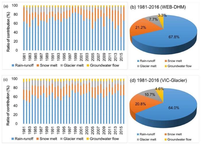 王磊表示,依托監(jiān)測網(wǎng)絡和其他多源數(shù)據(jù),研究團隊生成了1981-2019年這38年內(nèi)雅魯藏布江流域高時空分辨率降水數(shù)據(jù),在此基礎上進一步通過對比、綜合主流冰凍圈水文模型的徑流組分模擬,研究得出的結果顯示,雅魯藏布江流域(奴下水文站以上)新的降雨、融雪、冰川融化和地下水補給分別占總徑流的66%、21%、9%和4%。