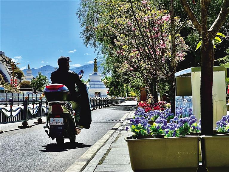 如今,走在市區(qū)街頭或公園,隨處可以看到開花的樹種,有的已經凋零,有的開得正艷,有的含苞待放。在布達拉宮腳下的北京中路道路兩側櫻花全面盛開,粉紅色的櫻花宛如云霞,花瓣隨著微風簌簌落下,煞是浪漫。將初夏的北京中路裝扮成一幅美麗的畫卷,吸引許多市民和游客賞花拍照。