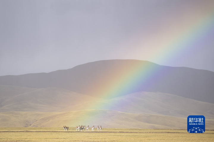 彩虹下的羌塘國家級自然保護(hù)區(qū)藏野驢。(新華社記者孫瑞博攝)