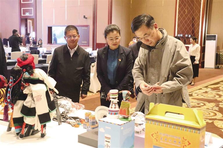 參觀人員觀看旅游文創(chuàng)產(chǎn)品。文/圖 記者 張琳