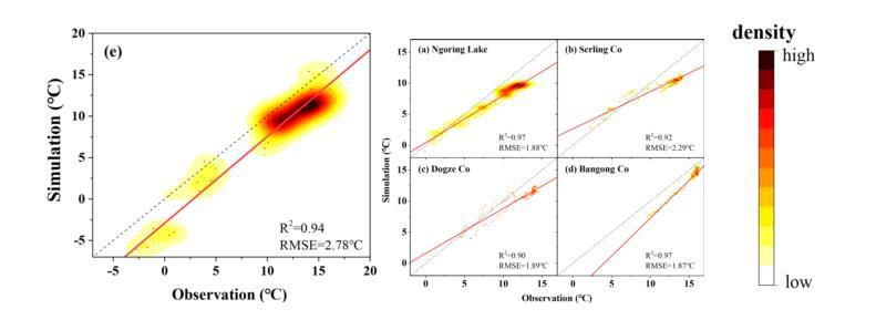 湖泊水溫是區(qū)域水分與能量平衡的重要變量,也是湖泊水生生態(tài)系統(tǒng)的控制性參數(shù)。由于常規(guī)地面觀測的局限,青藏高原湖泊水溫觀測數(shù)據(jù)普遍缺乏。團隊集成遙感與數(shù)值模擬技術,發(fā)展了水溫數(shù)據(jù)重建的技術框架,突破了模型數(shù)據(jù)要求高而移植性差的局限,實現(xiàn)了多相態(tài)(冰、水、冰水混合)下湖泊水溫的動態(tài)模擬,揭示了青藏高原湖泊水溫的時空演化規(guī)律及其對氣候變化的響應。