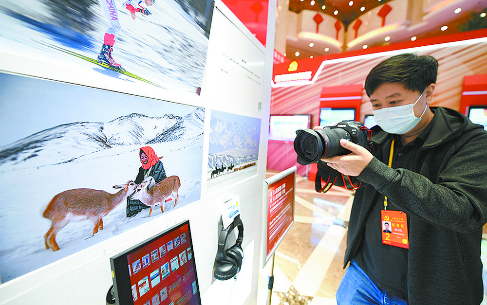 記者在新聞中心關(guān)注反映青海生態(tài)的照片。