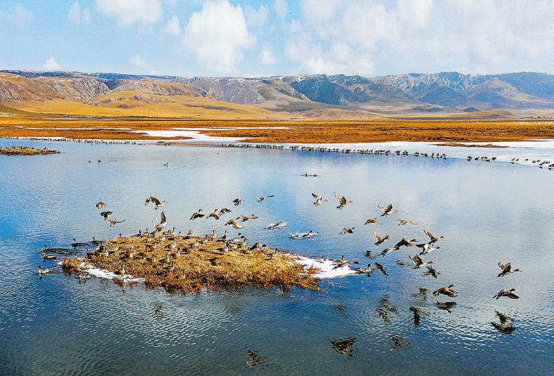 雪后陽光下,數(shù)千只飛禽在若爾蓋花湖嬉戲翱翔。 四川日報全媒體記者 尹鋼 攝(資料圖片)