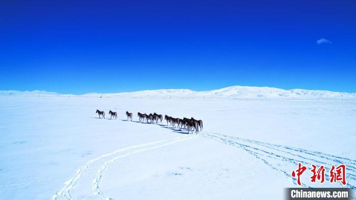 圖為黃河源頭瑪多出現(xiàn)積雪,藏野驢群在雪地里行走?!∑罹w龍 攝