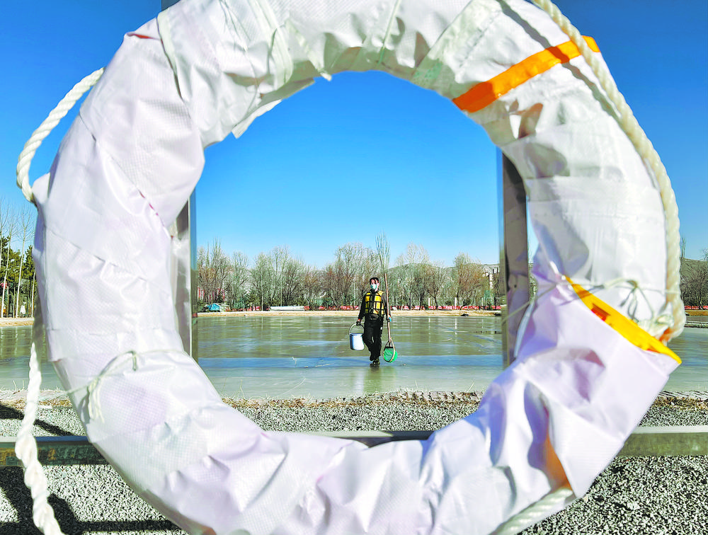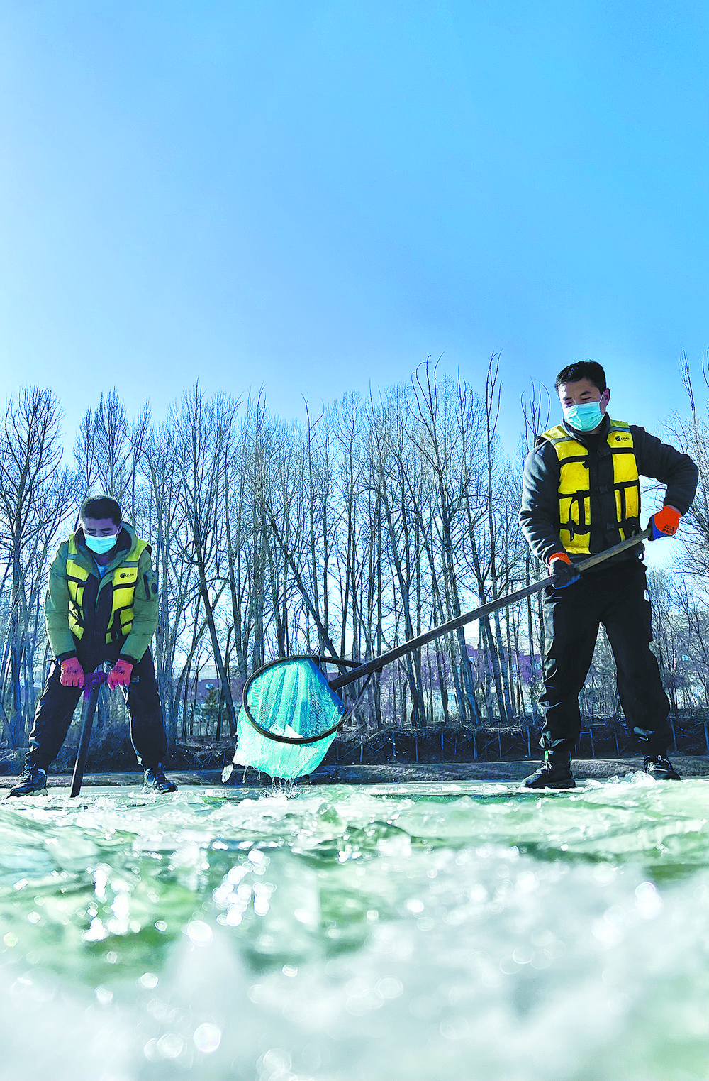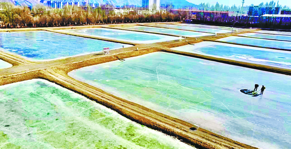 陽光透過冰面照射在18口冰封的魚塘里,為過冬的小魚苗增氧增溫。這片池塘是裸鯉來到裸鯉救護(hù)中心的第一站,田文根是這里的一名工作人員,主要負(fù)責(zé)室外原種場魚苗的培育和水質(zhì)監(jiān)測工作。據(jù)他介紹,魚塘的水質(zhì)決定著魚苗的健康狀況。在冬季,及時(shí)掃雪是一項(xiàng)非常重要的工作,因?yàn)楸鶎酉旅娴穆沲庺~苗是靠浮游植物通過光合作用產(chǎn)生的氧氣生存,如果雪附著在冰層上,陽光無法透進(jìn),就容易造成缺氧。