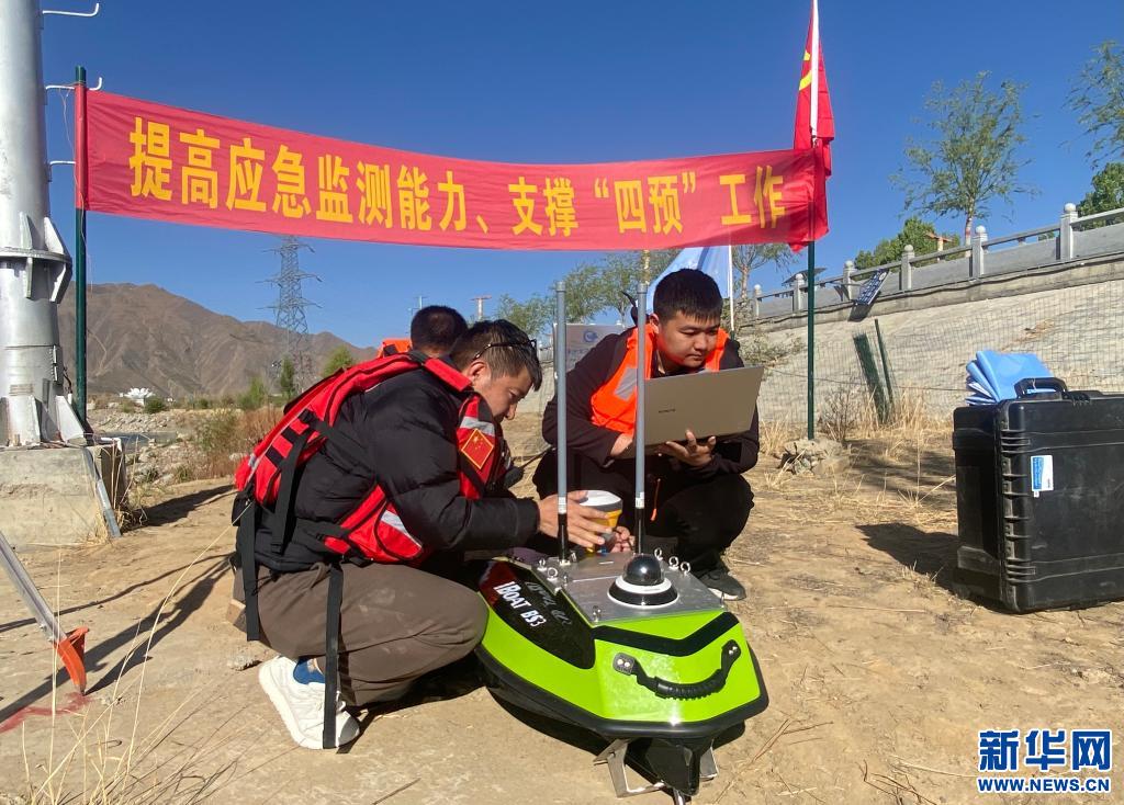 應(yīng)急演練現(xiàn)場(chǎng),參訓(xùn)人員正在通過(guò)新技術(shù)監(jiān)測(cè)拉薩河水文信息。(4月27日 攝) 新華社記者 春拉 攝