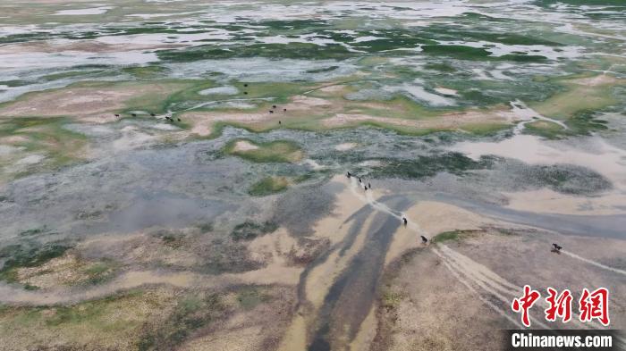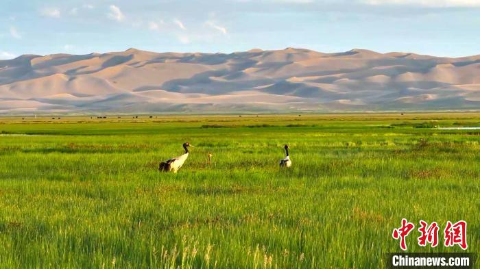 空中俯瞰阿爾金山國家級自然保護(hù)區(qū),芳草萋萋的依協(xié)克帕提濕地上,優(yōu)雅靈動的黑頸鶴夫婦正在教授新出生的黑頸鶴寶寶學(xué)習(xí)捕食的技巧;鶴群的不遠(yuǎn)處,藏原羚一邊享受著多汁的青草,一邊好奇地打量著周圍的環(huán)境。