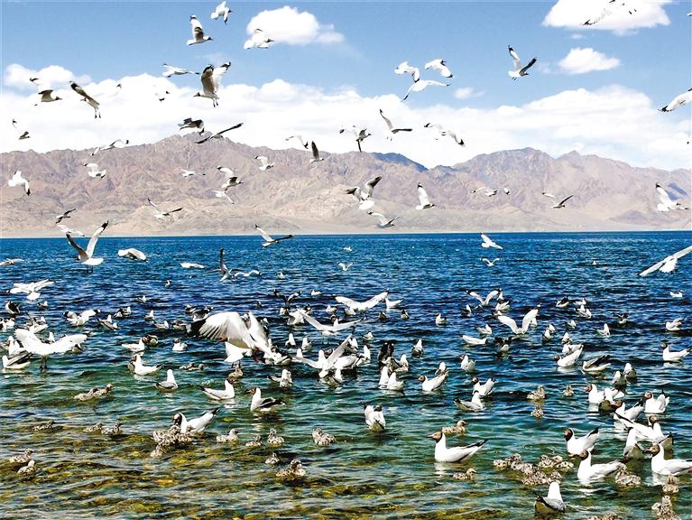班公湖位于西藏阿里地區(qū)日土縣西部,湖面平均海拔4200米。它的奇特之處在于,由東向西水中含鹽量遞增,湖水在陽光下呈現(xiàn)墨綠、淡綠和深藍(lán)等不同的顏色。這里碧波蕩漾,水草豐美,是名副其實(shí)的西陲明珠。