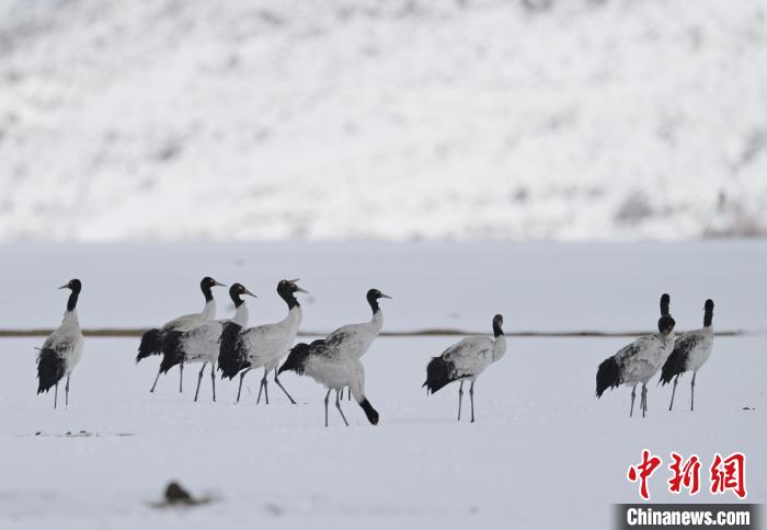 圖為12月14日,納帕海雪地中的黑頸鶴、斑頭雁等越冬鳥。陳志明 攝