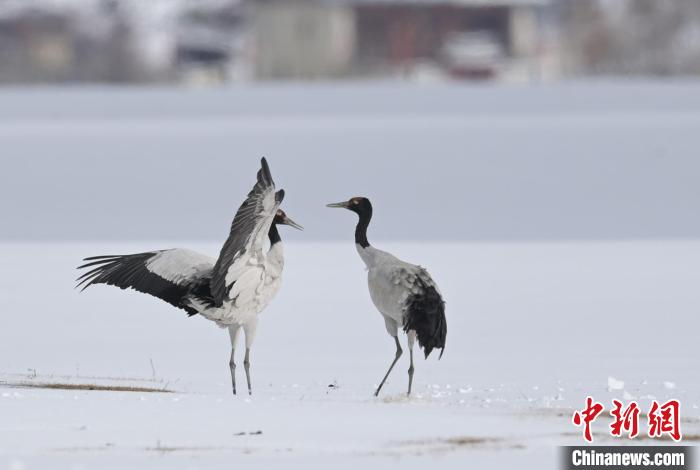 圖為12月14日,兩只黑頸鶴在納帕海雪地中起舞。陳志明 攝