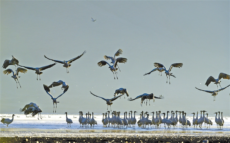 圖為林周縣境內的黑頸鶴在冬日朝陽下嬉戲?!∮浾摺∨硕唷z