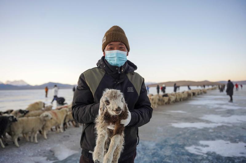 引路的牧羊人抱著羊羔走在前面,吸引著頭羊上冰。其他牧羊人驅(qū)趕著羊群跟在后面,幾只牧羊犬護(hù)衛(wèi)著羊群。