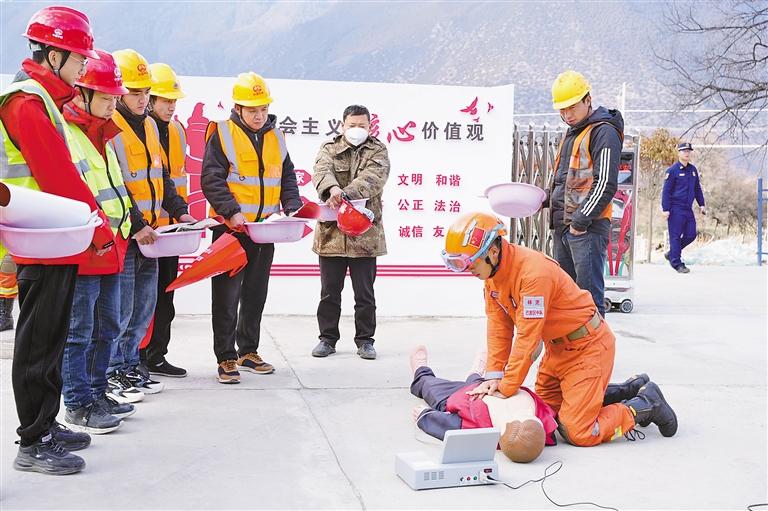 圖為林芝市森林消防支隊培訓隊員為中鐵職工講解心肺復蘇知識。