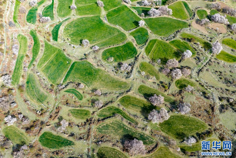 4月18日,在嘉黎縣尼屋鄉(xiāng)境內(nèi)田間盛開的桃花(無(wú)人機(jī)照片)。新華網(wǎng) 旦增努布 攝