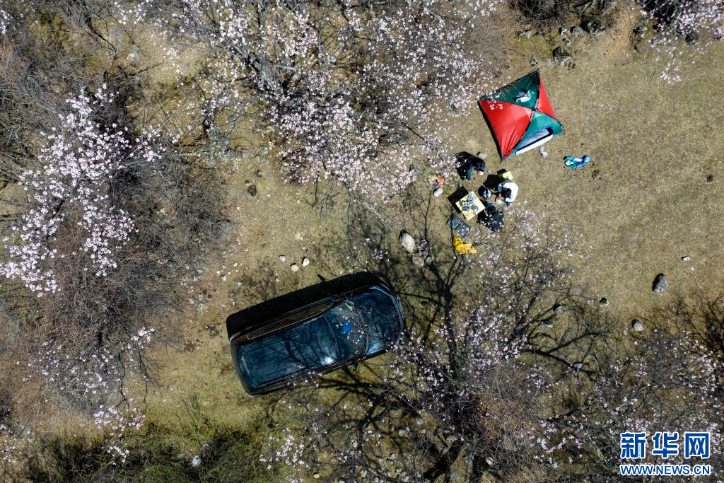 4月18日,群眾在嘉黎縣尼屋鄉(xiāng)境內(nèi)桃花間“過林卡”(無(wú)人機(jī)照片)。新華網(wǎng) 旦增努布 攝