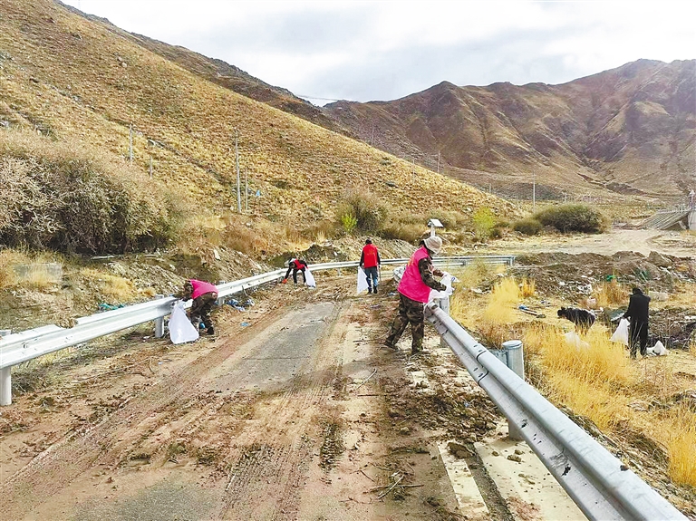 圖為志愿者對嘎巴村公路沿線和空地的白色垃圾、飲料瓶及塑料袋等進(jìn)行清理。記者 格桑倫珠 攝