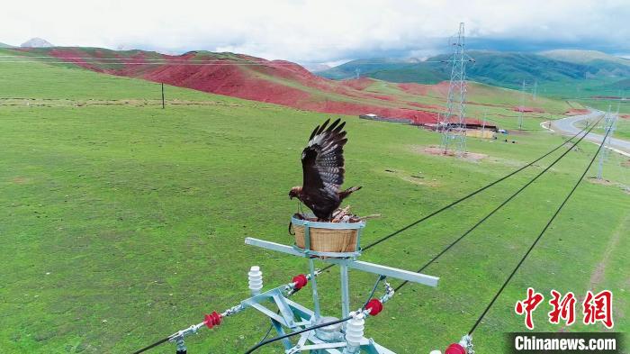 21日,在青海玉樹藏族自治州嘉塘草原,10千伏珍一路的67桿塔上,一只大鵟正在人工鳥巢內孵化幼鳥。鳥巢下方,國網(wǎng)玉樹供電公司運維檢修人員正在開展巡檢工作。