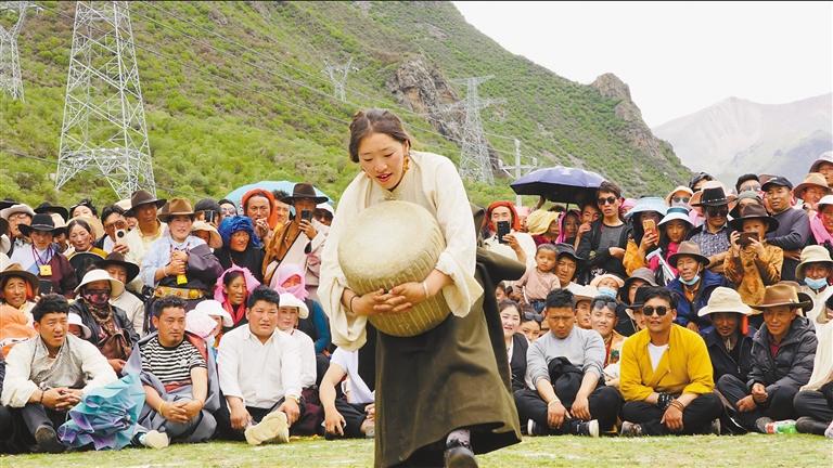 開幕式在藏雄村幼兒園小朋友表演的舞蹈《第一支花》中拉開序幕,唐古鄉(xiāng)、阿朗鄉(xiāng)、旁多鄉(xiāng)對(duì)北部三鄉(xiāng)獨(dú)特的文化藝術(shù)、生態(tài)環(huán)境以及豐富的“非遺”文化進(jìn)行展示與推介,還有特色服飾展演,他們將秀場(chǎng)搬到大自然,以“傳統(tǒng)民族服飾走秀+‘非遺’文化展示+牧區(qū)生活用具展示”為核心,配以林周縣唐古鄉(xiāng)關(guān)于北部三鄉(xiāng)服飾的唱頌詞與鼓點(diǎn)相融合,為展演提供了獨(dú)特的音樂伴奏,展現(xiàn)了林周縣北部三鄉(xiāng)豐富的民族文化。
