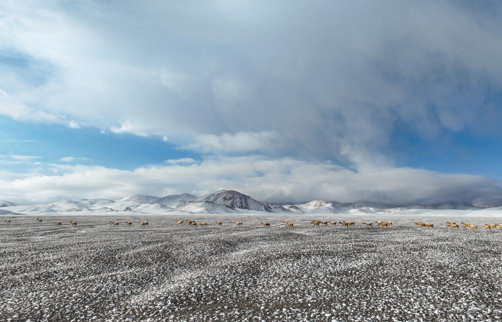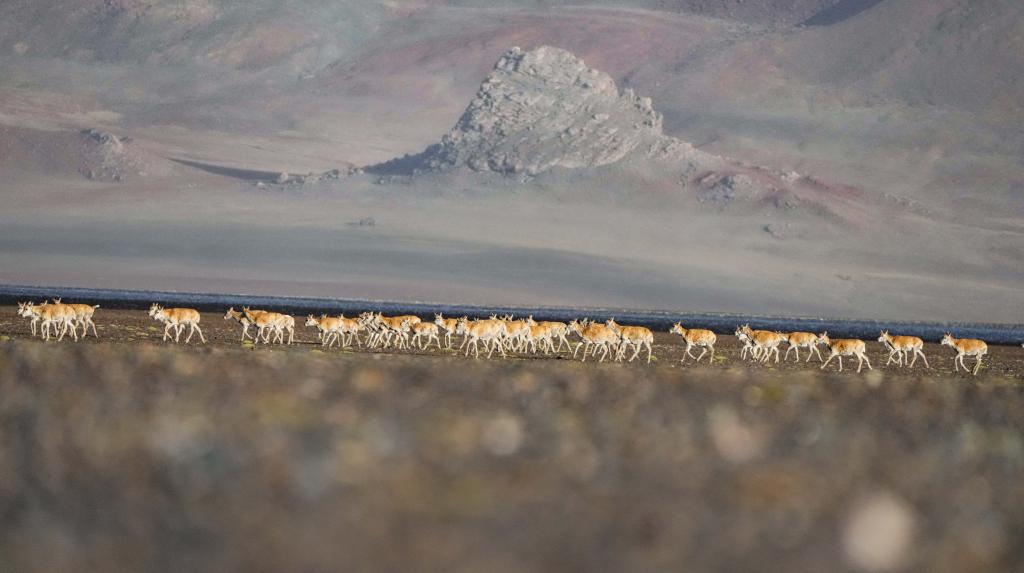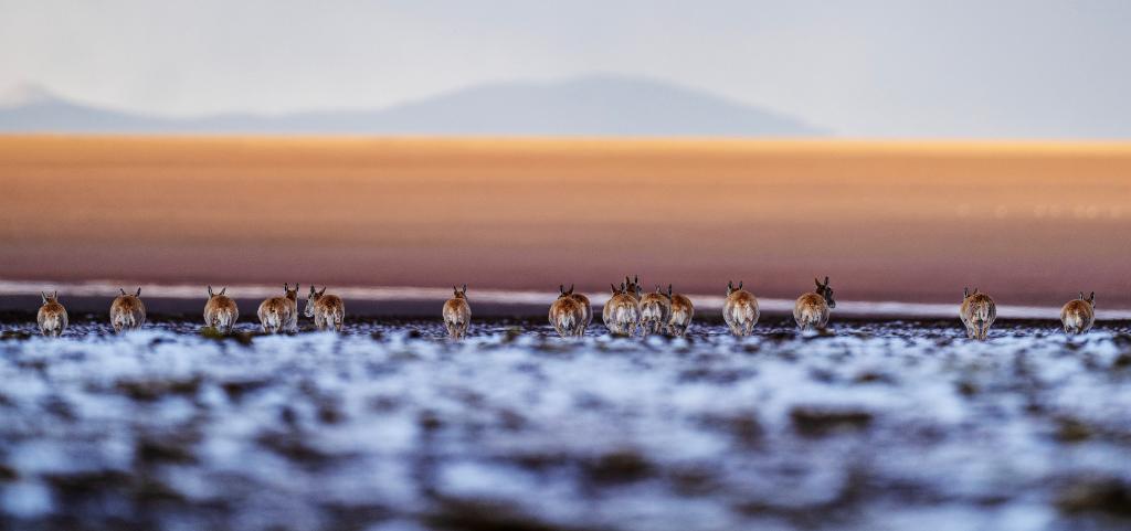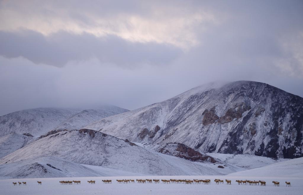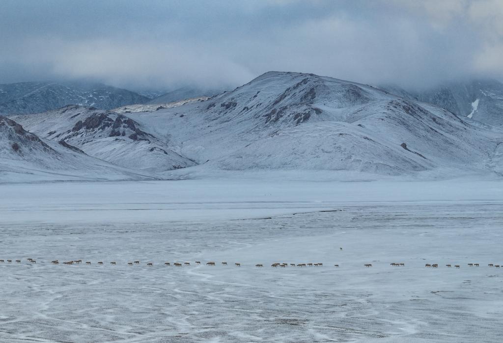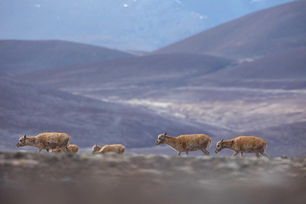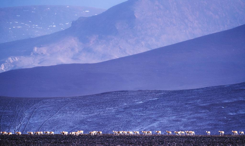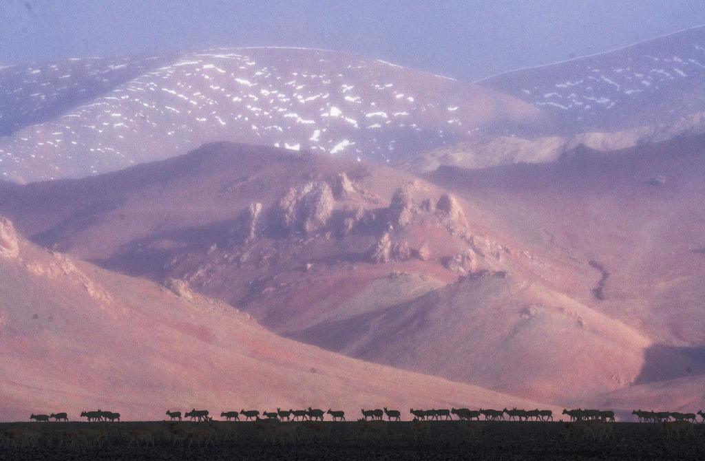 6月15日清晨在羌塘國(guó)家級(jí)自然保護(hù)區(qū)拍攝的遷徙中的母藏羚羊。