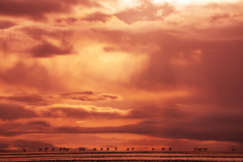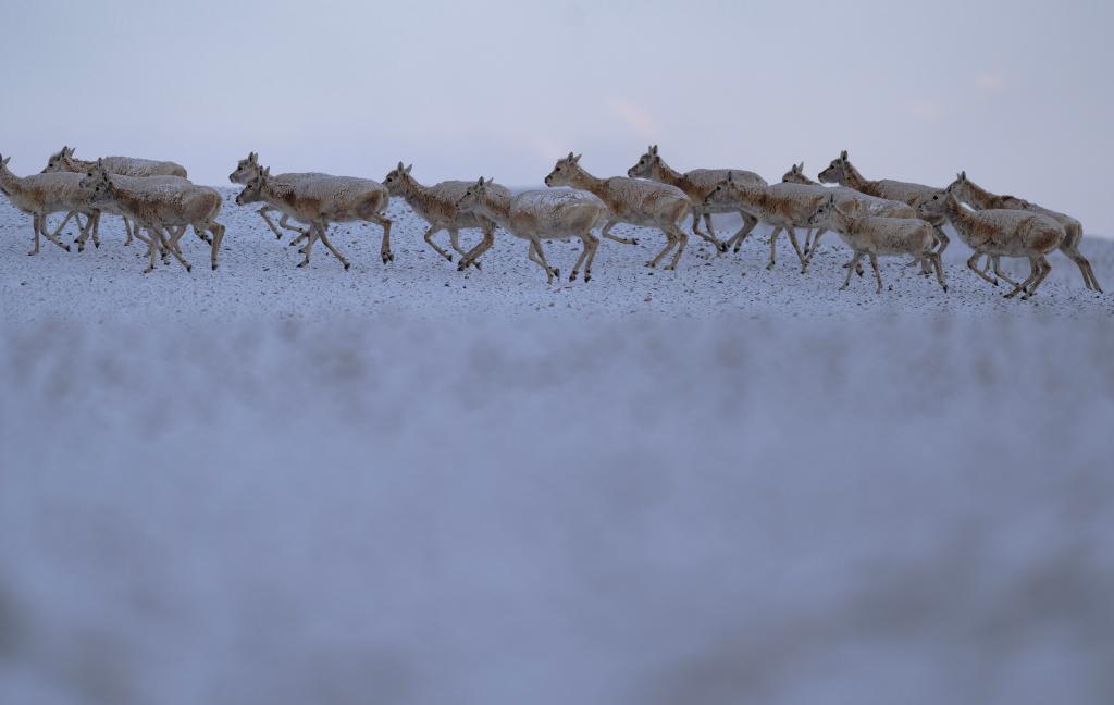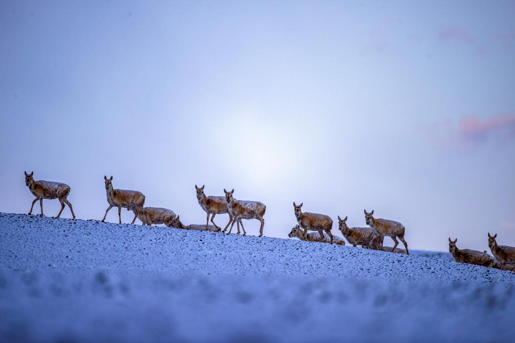 6月15日清晨雪后,在羌塘國(guó)家級(jí)自然保護(hù)區(qū),迎著朝霞前行在遷徙路上的一群藏羚羊。