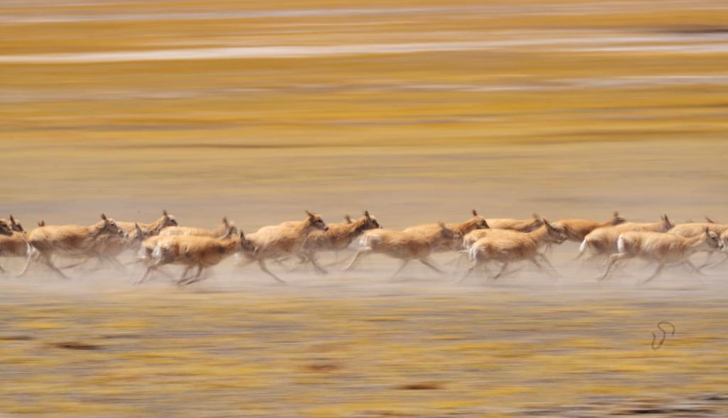 6月13日,在羌塘國(guó)家級(jí)自然保護(hù)區(qū),遷徙中的藏羚羊奔跑起來(lái)。
