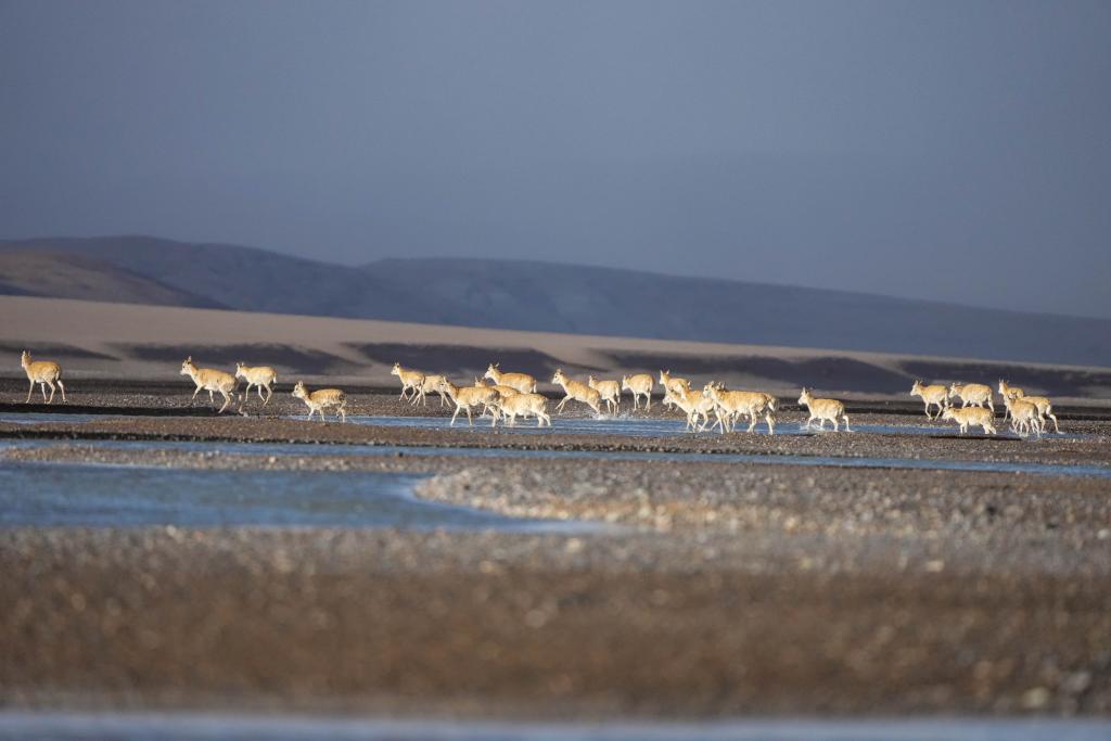 6月13日傍晚,在羌塘國(guó)家級(jí)自然保護(hù)區(qū),遷徙中的母藏羚羊越過甜水河。
